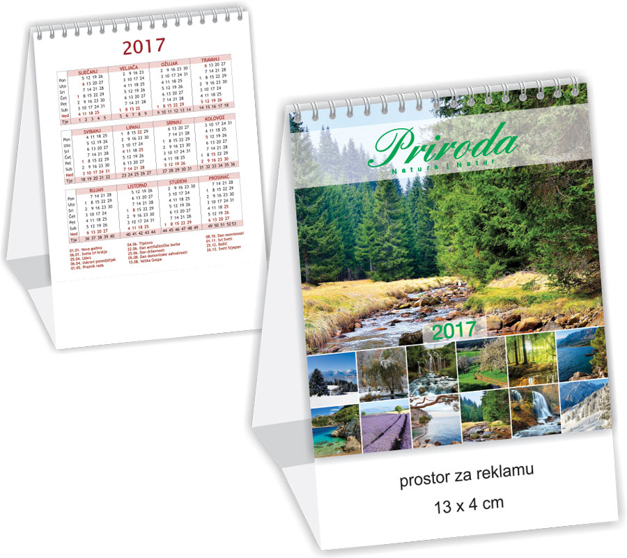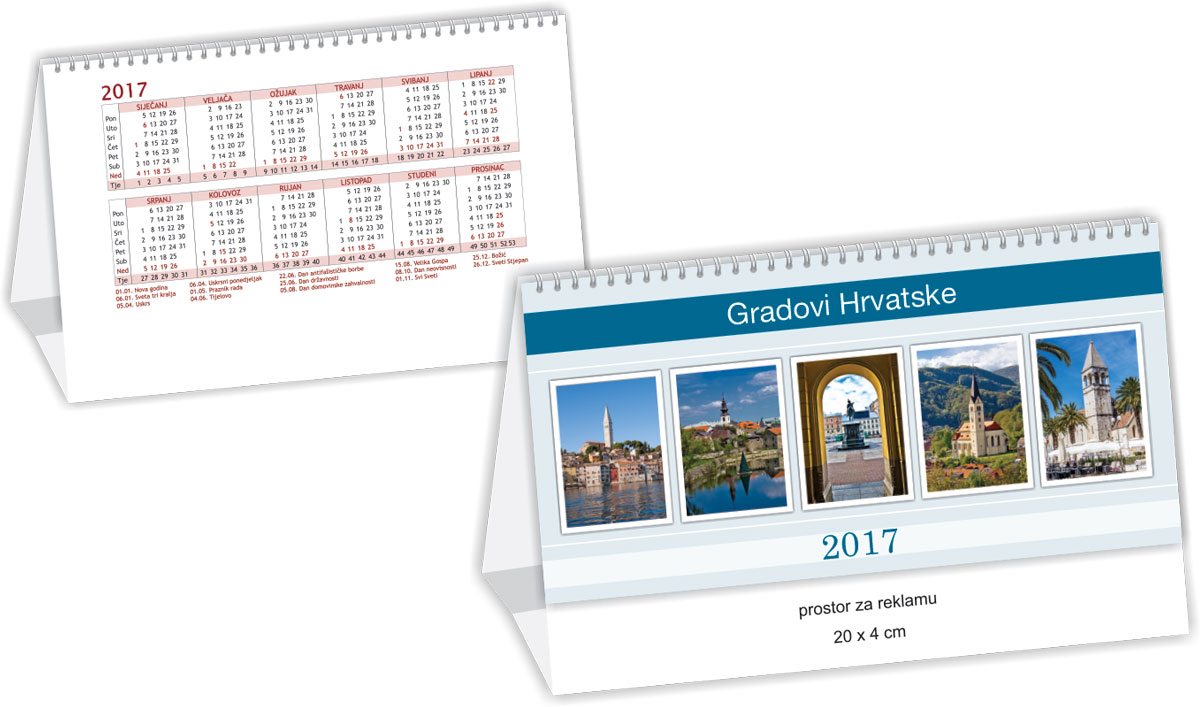 Stolne kalendare izrađivali smo do sada u dvije varijante, kao samostojeći stolni kalendari s 12 listova s 12 različitih motiva sa spiralnim uvezom i kao stolni kalendari istih karakteristika samo način uveza je ljepljenjem.