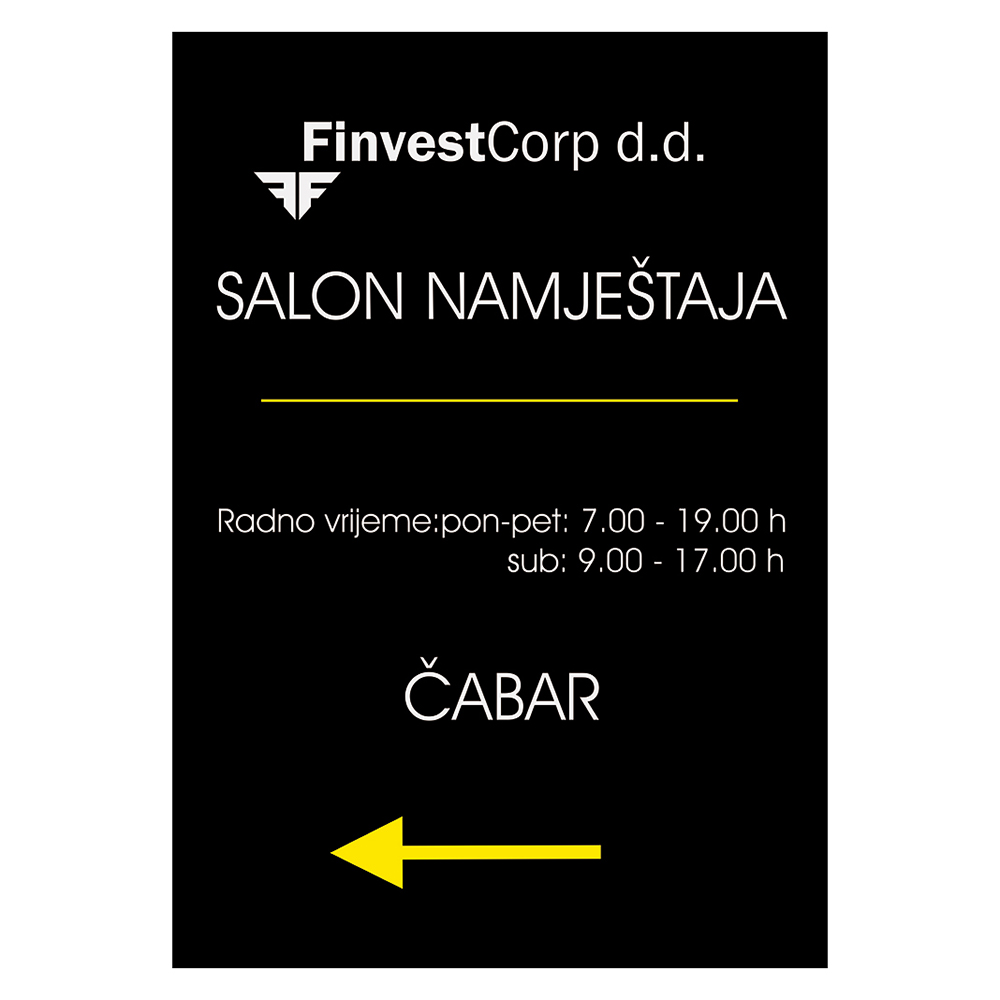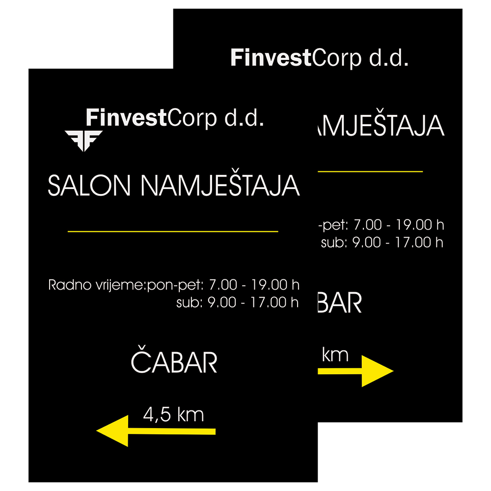 Tehnika izrade: Eko solventni print na vinyl + aplikacija na pločasti materijal te zaštita printa laminacijom, UV stabilnost i postojanost
