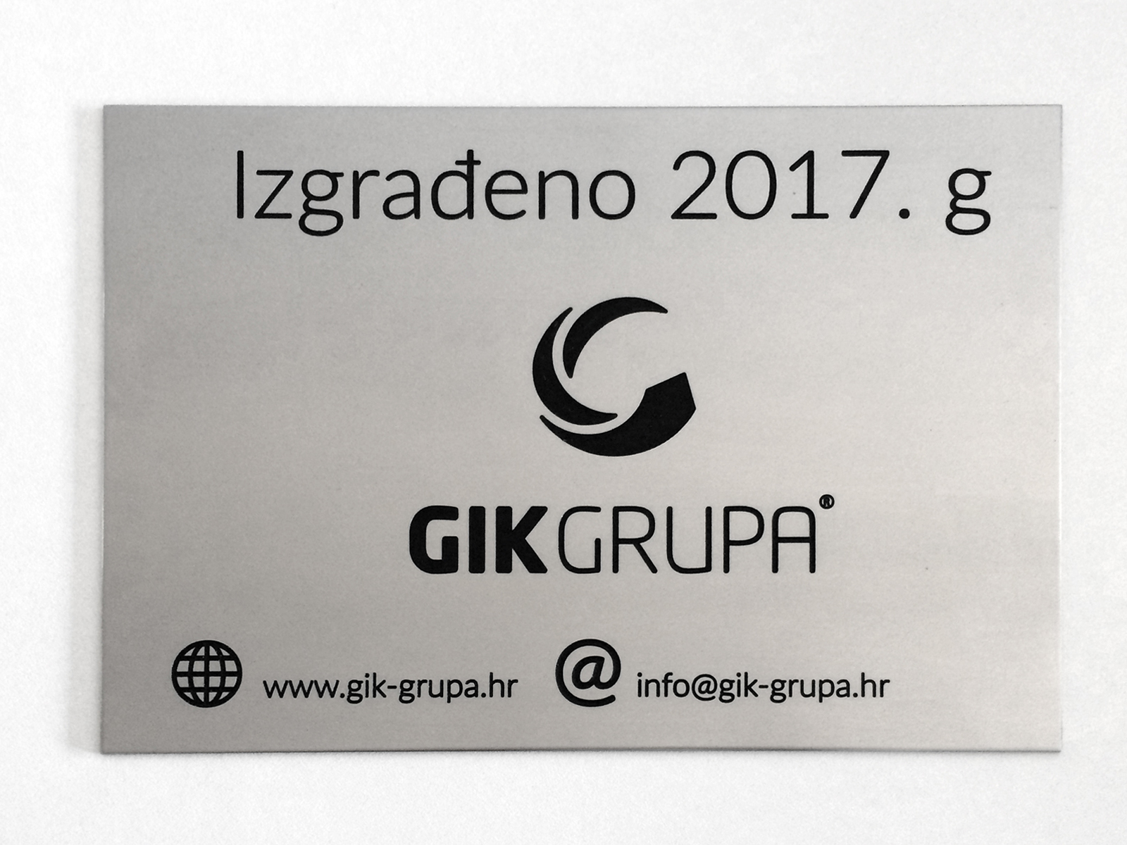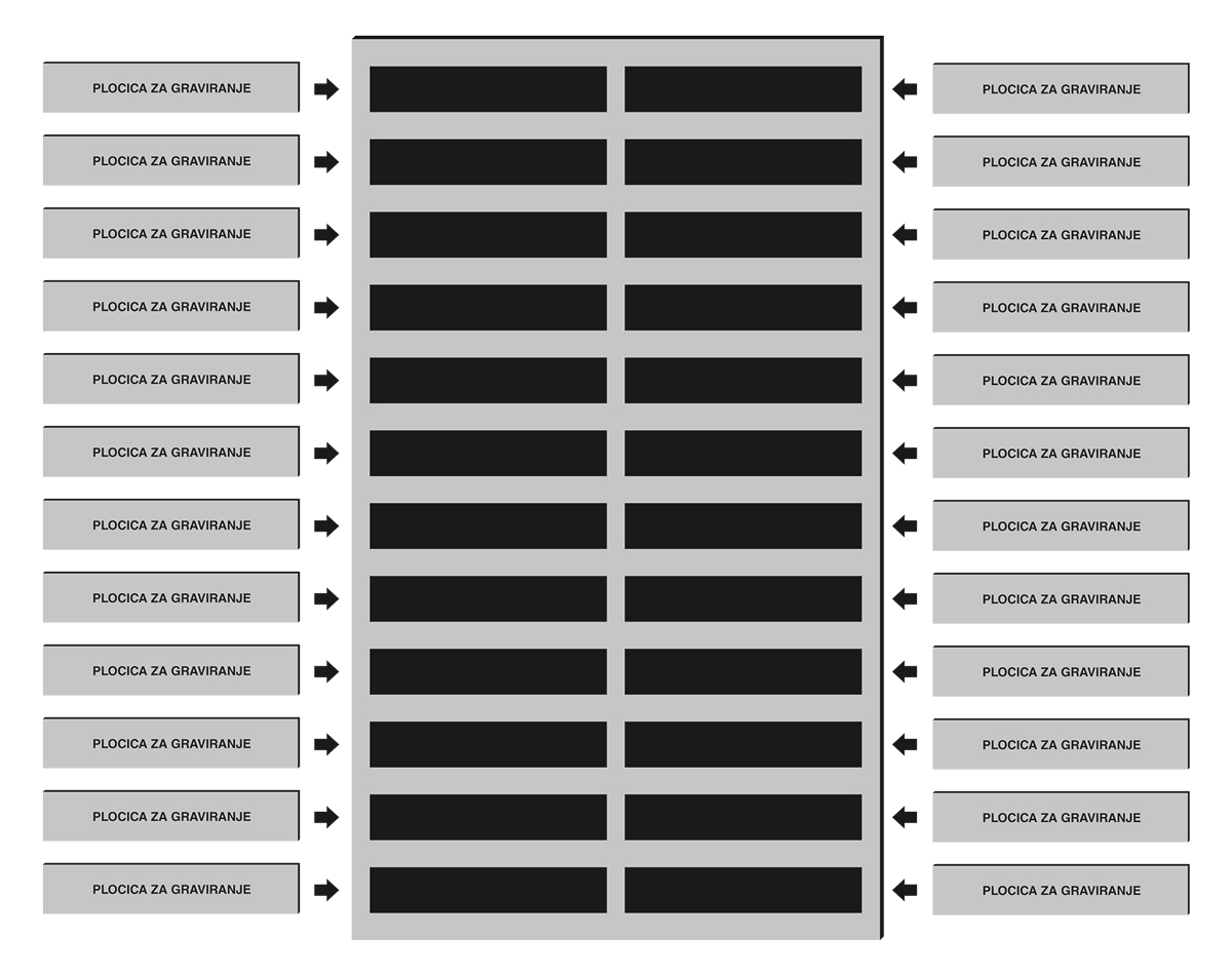 Tehnika izrade: CNC dubinsko graviranje inox-a, ispuna graviranog sadržaja dvokomponentnom crnom bojom, fiksiranje boje visokom temperaturom, završna obrada poliranjeN |