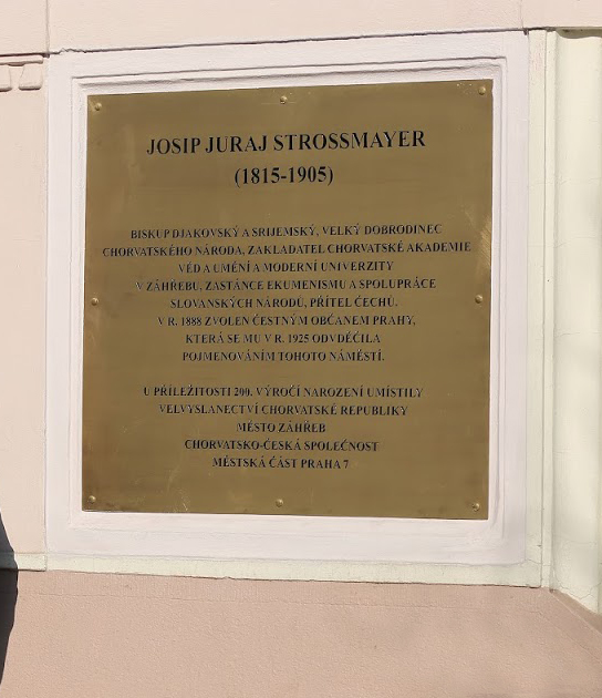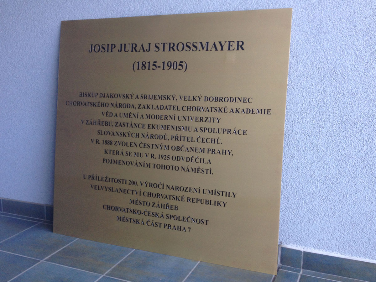 Tehnika izrade: CNC dubinsko graviranje mesinga, ispuna graviranog sadržaja dvokomponentnom crnom bojom, fiksiranje boje visokom temperaturom, satiniranje - brušenje, završna obrada termoplastifikacija prozirnim prahom (UV stabilnost, otpornost, trajnost). Ploča je postavljena u Pragu povodom 200-te godišnjice Josipa Juraja Štrosmayera |