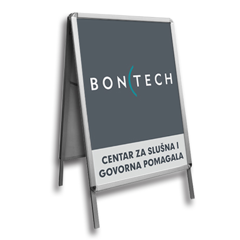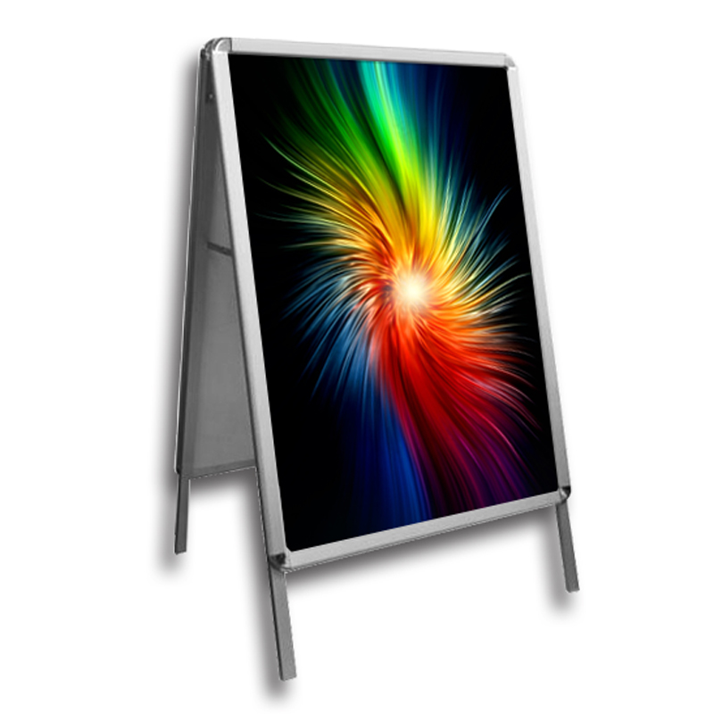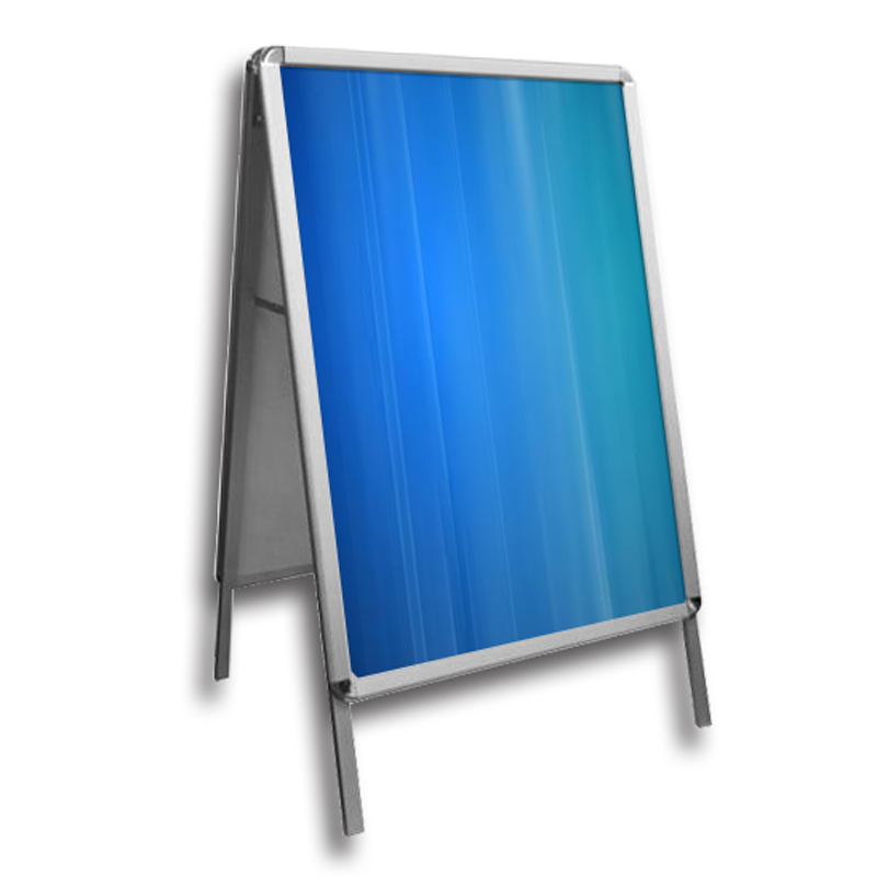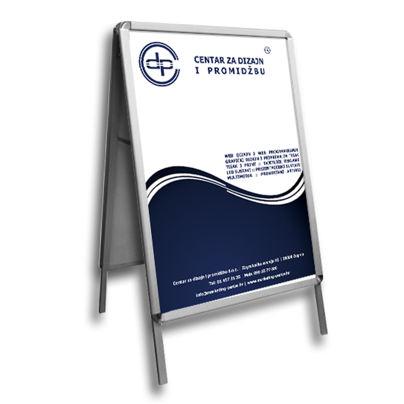 A – stalak s klik klak okvirima predstavlja vrlo funkcionalno rješenje za plakatno oglašavanje. Namijenjen je, kako za unutarnje, tako i za vanjske prostore. Stalak je vodootporan s projektiranim otvorima za otjecanje nakupljene vode. Vrlo laka izmjena plakata. Zaštita plakata kvalitetnom folijom. Dostupne izvedbe sa zaobljenim ili rezanim kutovima. Svaki A - stalak isporučuje se u zasebnom pakiranju.