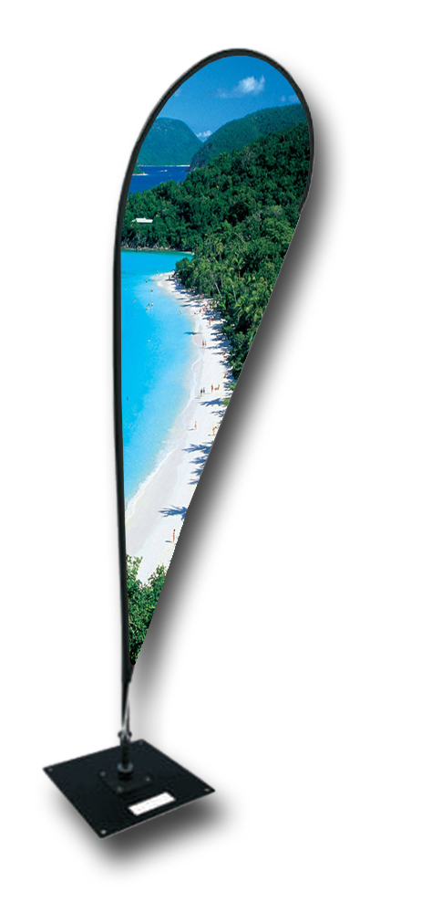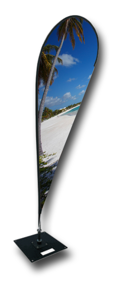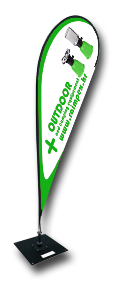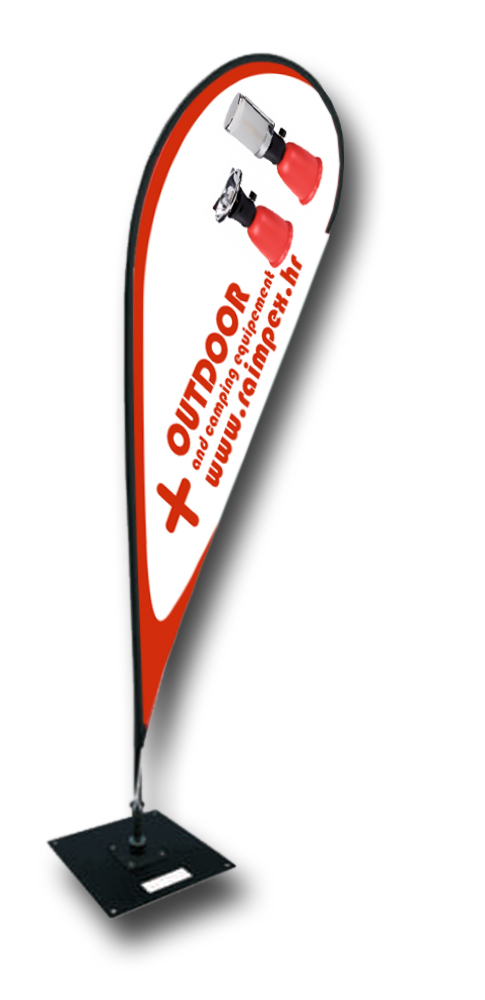 BEACH FLAG predstavlja idealna reklamno rješenje, ciljano za promidžbu na vanjskim prostorima. Vrlo je uočljiv zbog svoje veličine i oblika zastave pa izvanredno privlači pažnju posjetitelja na plažama i kampovima, ali isto tako je dobro promidžbeno rješenje prilikom raznih sajmova ili manifestacija. Platno za tisak grafike je specifičnog oblika, a isto tako i postavljeno na jarbol koji stoji na širokoj i masivnoj bazi koja omogućuje stabilnost i u vjetrovitim uvjetima. Također, opcionalno postoji i konstrukcijsko rješenje za stabilnost na zemljanom ili pjeskovitom tlu.